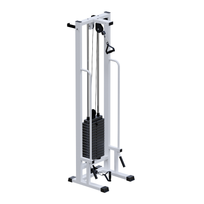 Грузоблочный стек состоит из металлических обрезиненных плит по 5 кг с хромированными направляющими. Регулировка нагрузки осуществляется при помощи металлической иглы-фиксатора. Передача усилия реализована через трос диаметром 5 мм в ПВХ-оплётке с разрывным усилием 500 кг и допустимой рабочей нагрузкой до 800 кг, обеспечивая высокий запас надёжности.