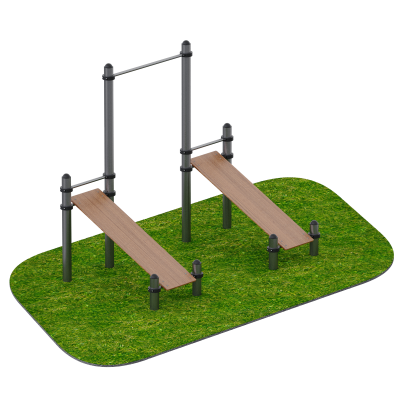 Прочная металлическая рама обеспечивает устойчивость при выполнении динамических упражнений. Атмосферостойкое покрытие защищает элементы конструкции от коррозии и сохраняет эксплуатационные характеристики при круглогодичном использовании.