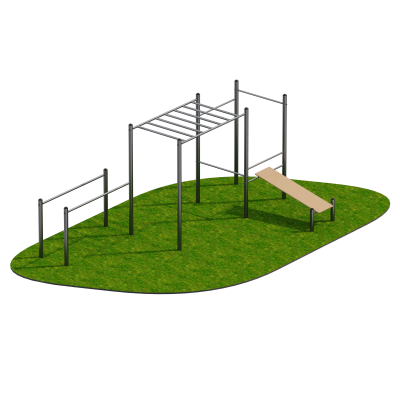 Перекладины изготовлены из трубы диаметром 34 мм и крепятся к стойкам в антивандальный стакан с защитой от выкручивания. Такое крепление обеспечивает жёсткость соединений и устойчивость к механическим воздействиям. Лежак выполнен из влагостойкой ламинированной фанеры толщиной 18 мм с противоскользящим тиснением, что обеспечивает комфорт и безопасность во время тренировок.