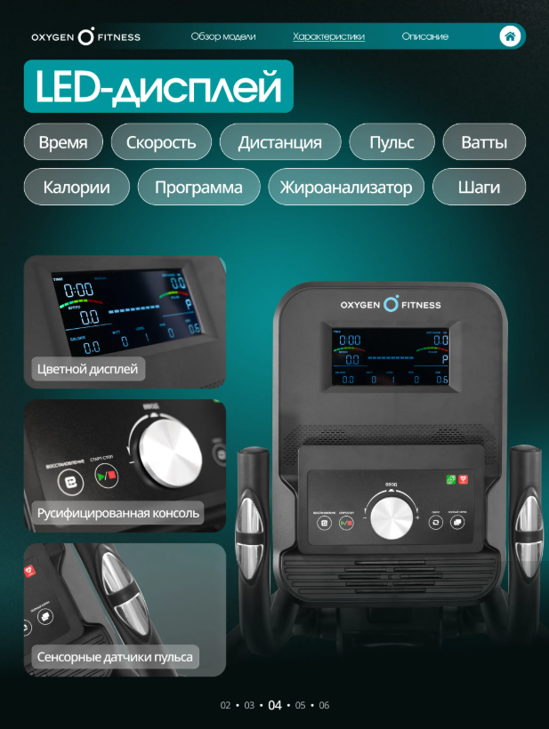 OXYGEN FITNESS SONOMA — современный эллиптический тренажёр для домашних кардиотренировок, сочетающий плавную биомеханику, электронную систему нагружения и расширенные цифровые возможности. Модель подойдёт для пользователей, которые хотят тренироваться регулярно, контролировать нагрузку и использовать интерактивные форматы занятий без перегрузки суставов. Тренажёр построен на высокопрочной раме с антикоррозийной обработкой и двухслойной покраской, что обеспечивает устойчивость и долговечность конструкции. Корпус выполнен из ударопрочного полистирола HIPS, устойчивого к механическим нагрузкам и износу. Ключевые параметры движения: • Инерционный вес маховика24 кг(BioFusion™) при реальном весе6 кг— ровный и стабильный ход без рывков. • Длина шага460 мм— комфортная амплитуда движения для пользователей разного уровня подготовки. • Расстояние между педалями80 мм— устойчивое и безопасное положение ног. • Трёхкомпонентный шатун — повышенная надёжность и ресурс педального узла. Увеличенные антискользящие педали обеспечивают уверенную фиксацию стопы, а двухпозиционные рукоятки позволяют задействовать мышцы верхней части тела. OXYGEN FITNESS SONOMA оснащён электромагнитной системой нагружения с 16 уровнями сопротивления, регулируемыми электронно. Это позволяет точно подбирать интенсивность тренировки и плавно менять нагрузку в процессе занятия. Цветная LED-консоль отображает расширенный набор тренировочных показателей: • время, скорость, дистанцию, • калории и пульс, • программу, Ватты, • жироанализатор и количество шагов. Программный пакет включает 20 режимов тренировок: • быстрый старт и ручной режим, • 10 предустановленных программ, • 4 пульсозависимые программы, • 4 пользовательские программы, • режим работы по Ваттам и жироанализатор. Для более точного контроля пульса предусмотрены сенсорные датчики на поручнях, а также возможность подключения Bluetooth-кардиодатчика (приобретается отдельно). Тренажёр поддерживает Bluetooth-подключение к популярным приложениям Kinomap™ и Zwift™ с интерактивным уровнем интеграции, что делает тренировки более вовлекающими и разнообразными. Дополнительные элементы комфорта: • подставка под планшет или смартфон, • подставка для бутылки, • удлинённый сетевой шнур4 м, • транспортировочные ролики и компенсаторы неровностей пола. Интерфейс доступен на русском и английском языках. Тренажёр работает от сети 220 В и рассчитан на пользователей весом до150 кг. OXYGEN FITNESS SONOMA — сбалансированный эллиптический тренажёр для дома, который объединяет комфортную биомеханику, современные технологии и функциональность, необходимую для эффективных и разнообразных кардиотренировок.