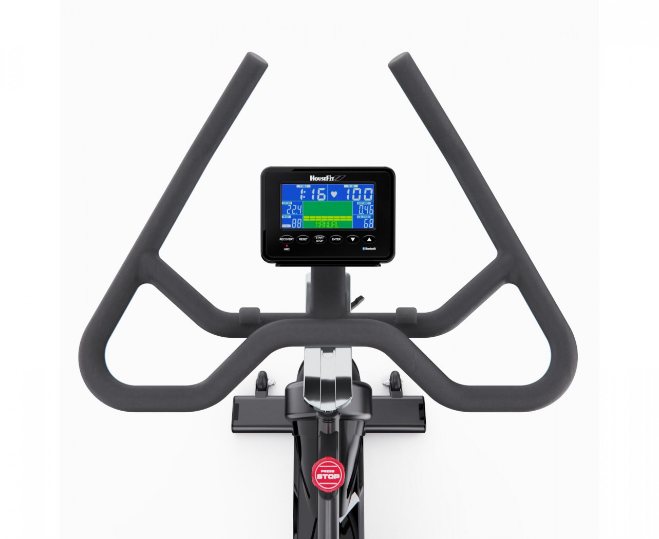 На LCD-дисплее с синей подсветкой отображаются все необходимые параметры: скорость, время, дистанция, сожжённые калории, мощность (ватт), обороты в минуту и пульс (для измерения пульса необходимо использовать нагрудный ремень, не входит в комплект). Консоль включает 6 тренировочных программ: ручной режим, начинающий, продвинутый, спортивный, кардио и режим энергопотребления (ватт). Поддержка Bluetooth и приложение iConsole позволяют отслеживать прогресс в режиме реального времени и сохранять данные тренировок.